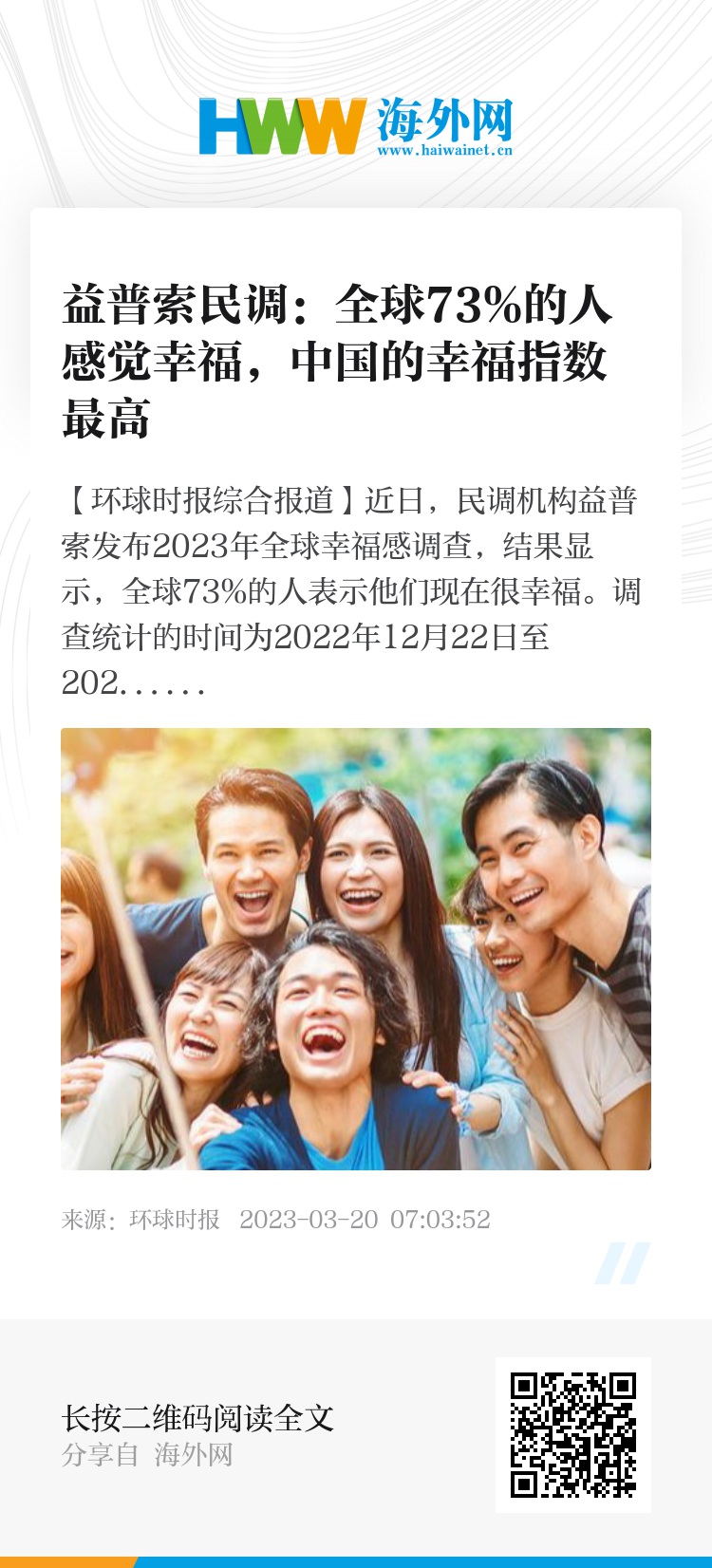 【环球时报综合报道】近日,民调机构益普索发布2023年全球幸福感调查,结果显示,全球73%的人表示他们现在很幸福。