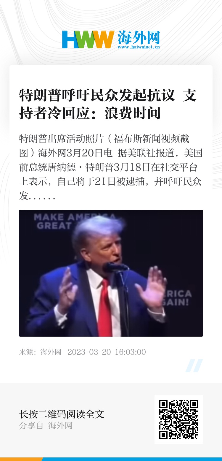 海外网3月20日电 据美联社报道,美国前总统唐纳德·特朗普3月18日在社交平台上表示,自己将于21日被逮捕,并呼吁民众发起抗议。然而,特朗普的许多支持者选择保持沉默,并未举行任何抗议活动。