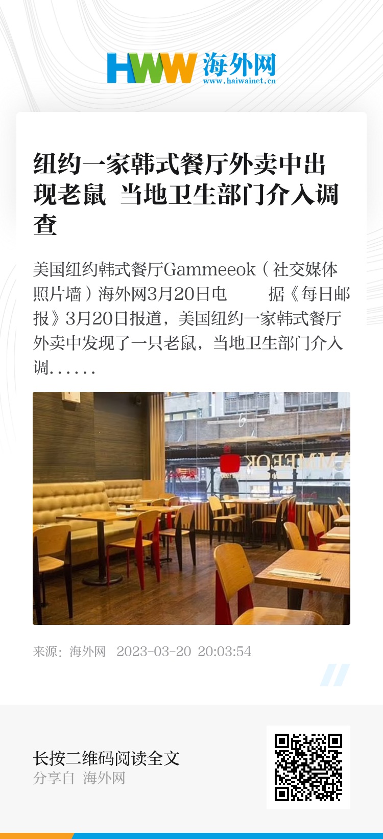 海外网3月20日电 据《每日邮报》3月20日报道,美国纽约一家韩式餐厅外卖中发现了一只老鼠,当地卫生部门介入调查,这家餐厅目前已被关闭。