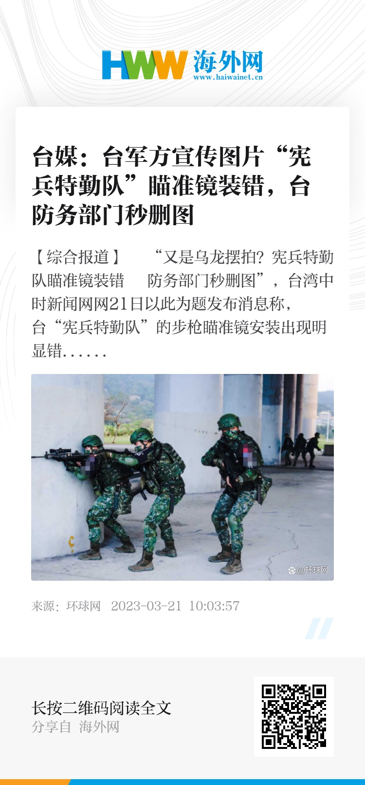 【环球网综合报道】 “又是乌龙摆拍?宪兵特勤队瞄准镜装错 防务部门秒删图”,台湾中时新闻网网21日以此为题发布消息称,台“宪兵特勤队”的步枪瞄准镜安装出现明显错误,它过于靠前,射手几乎无法利用这只瞄准镜搜索目标。报道称,几小时后,台防务部门发在脸书的这张照片被删除,换上了一张“宪兵重机车队”的照片,显然台防务部门也发现了错误。