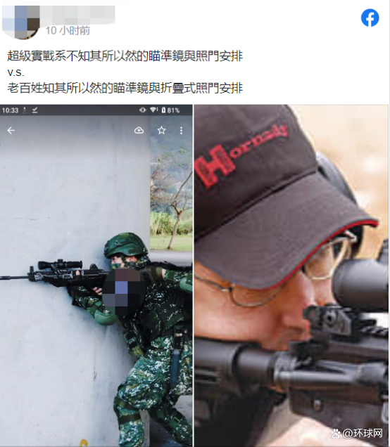 有岛内网友在脸书发布“超级实战系不知其所以然的瞄准镜与照门VS老百姓知其所以然的瞄准镜与照门”安装对比图。图自中时新闻网