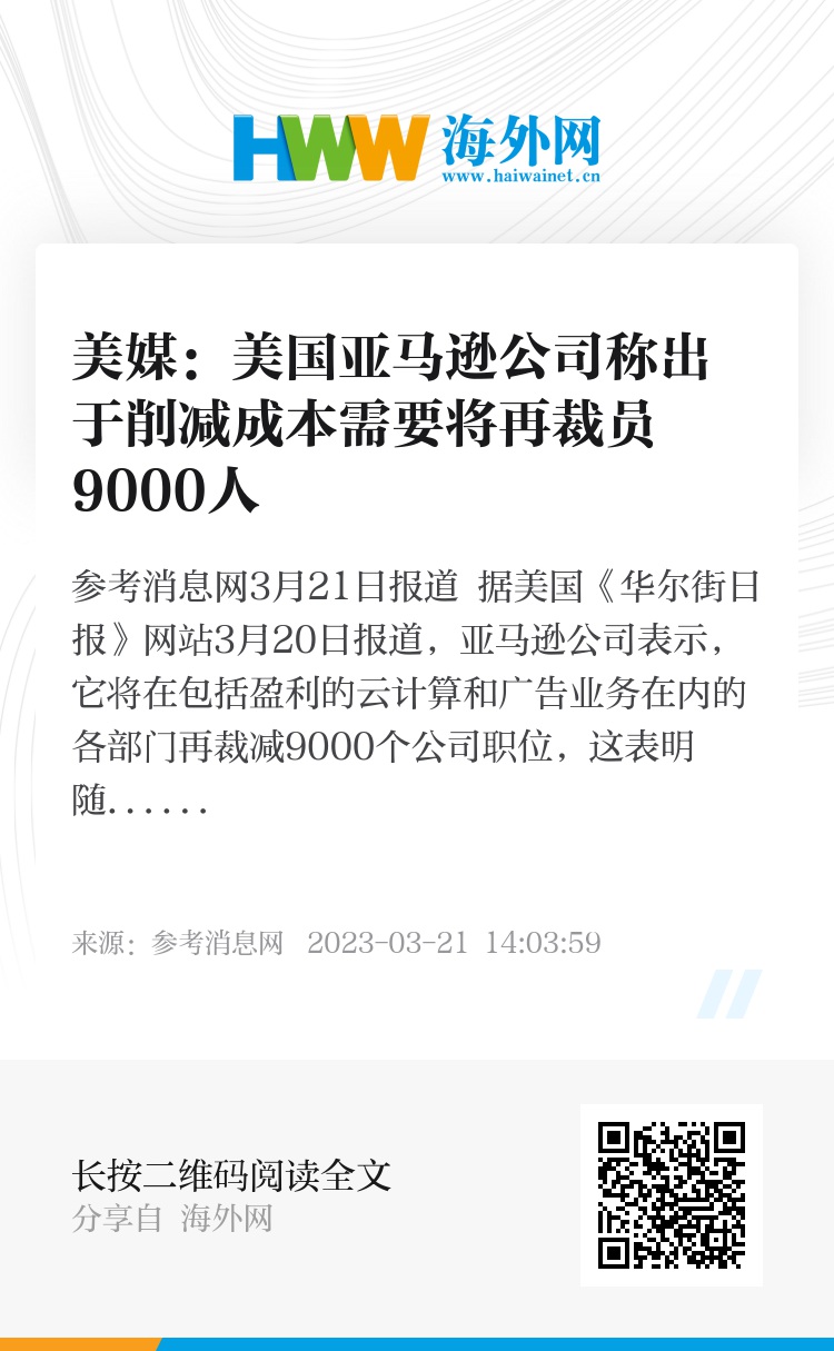 参考消息网3月21日报道 据美国《华尔街日报》网站3月20日报道,亚马逊公司表示,它将在包括盈利的云计算和广告业务在内的各部门再裁减9000个公司职位,这表明随着各大科技巨头继续削减开支,该公司的成本削减正在扩展到其业务的各个方面。