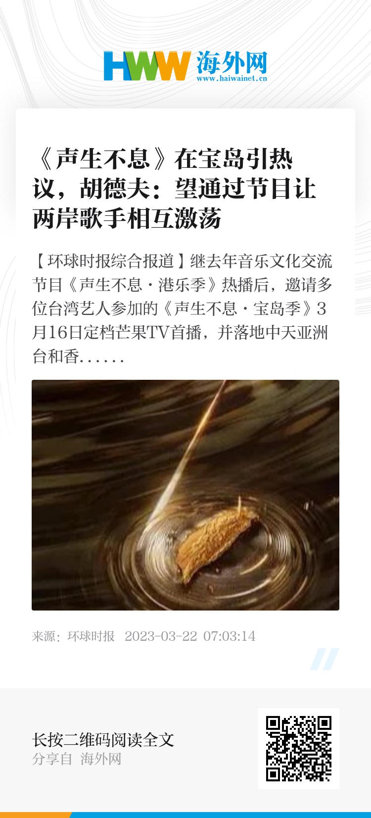 【环球时报综合报道】继去年音乐文化交流节目《声生不息·港乐季》热播后,邀请多位台湾艺人参加的《声生不息·宝岛季》3月16日定档芒果TV首播,并落地中天亚洲台和香港无线播出,消息引发了岛内外热烈讨论。