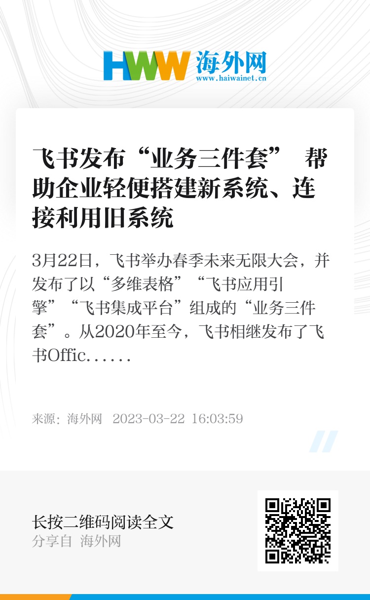 3月22日,飞书举办春季未来无限大会,并发布了以“多维表格”“飞书应用引擎”“飞书集成平台”组成的“业务三件套”。从2020年至今,飞书相继发布了飞书Office、飞书People等产品,“业务三件套”的发布,也标志着飞书继协同办公、组织管理后,进一步拓宽至业务工具,帮助企业向内要效率、向外要增量。