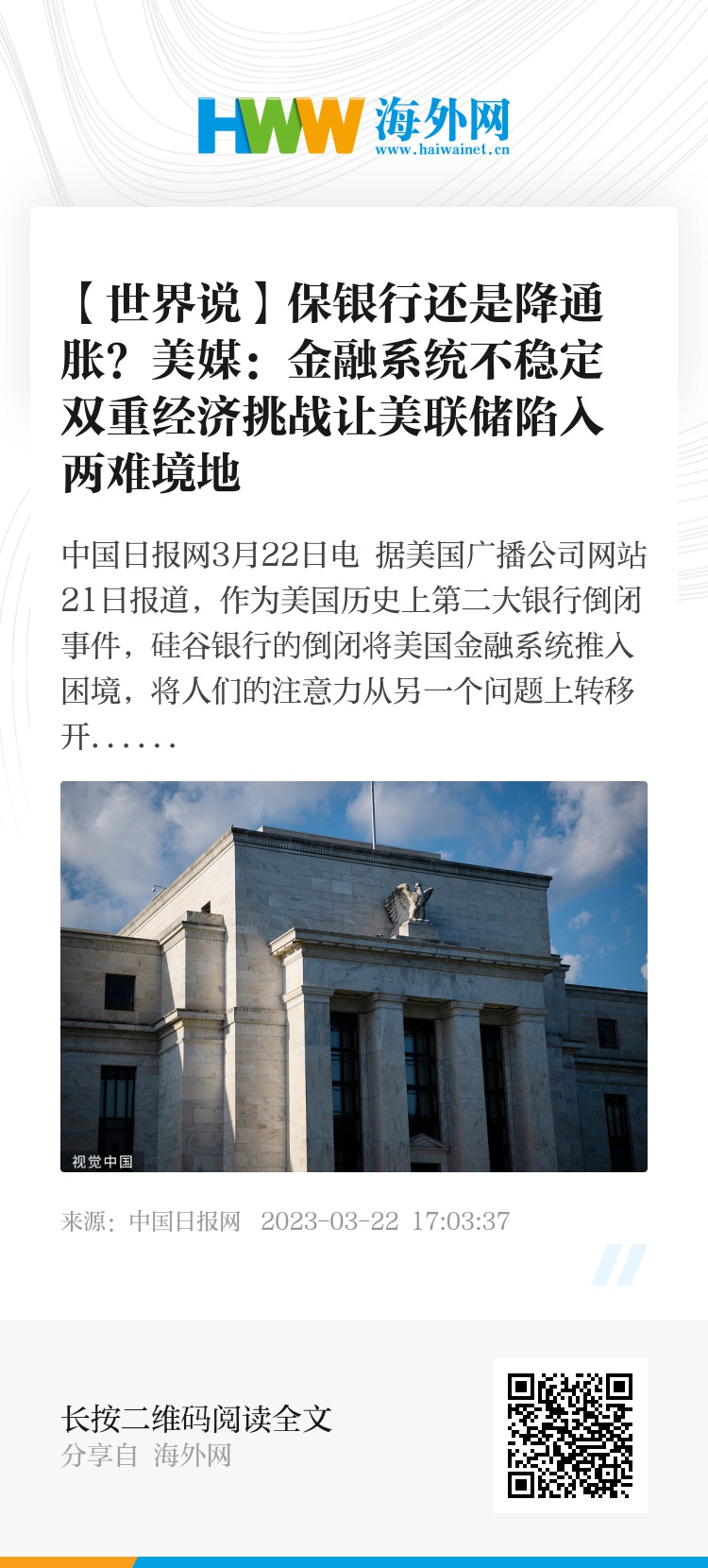 中国日报网3月22日电 据美国广播公司网站21日报道,作为美国历史上第二大银行倒闭事件,硅谷银行的倒闭将美国金融系统推入困境,将人们的注意力从另一个问题上转移开:依然高企的通货膨胀。双重经济挑战为美联储带来困境,因为基准利率这一美联储认为最有力的工具是导致金融危机的关键原因,却是解决物价高企的主要途径。
