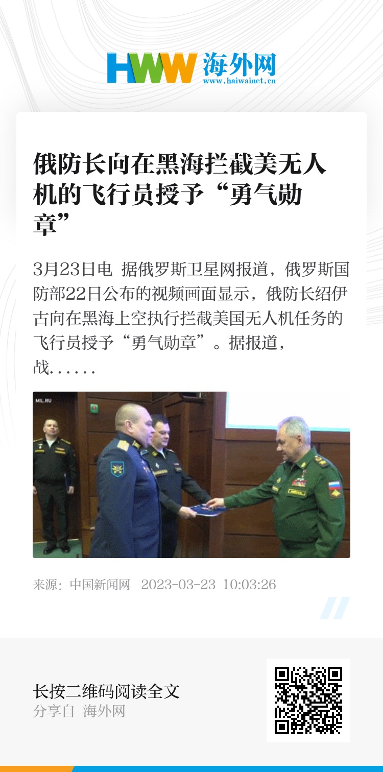中新网3月23日电 据俄罗斯卫星网报道,俄罗斯国防部22日公布的视频画面显示,俄防长绍伊古向在黑海上空执行拦截美国无人机任务的飞行员授予“勇气勋章”。