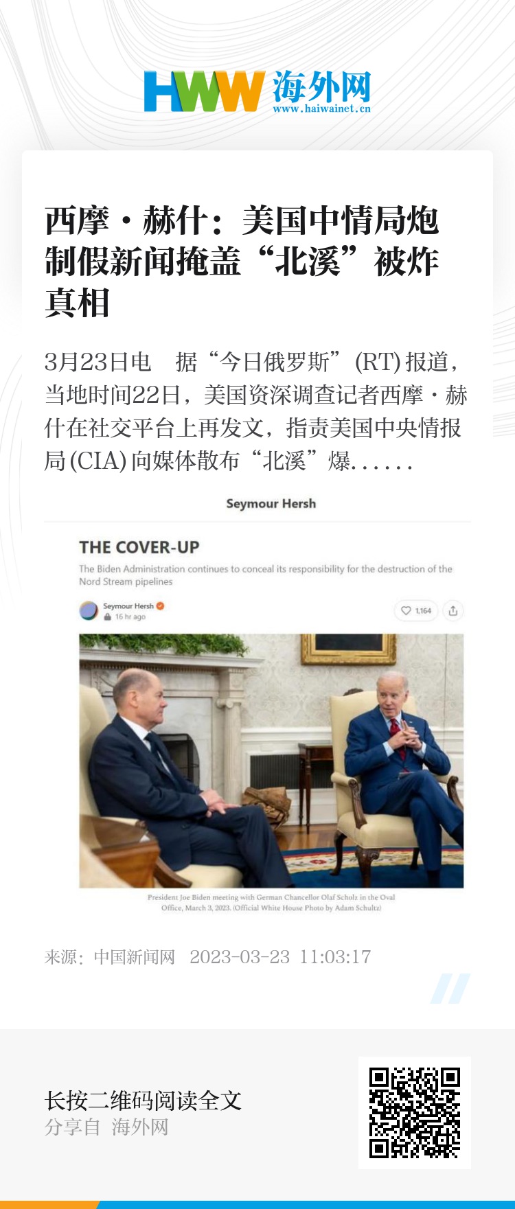 2023年2月8日,赫什曾爆料,炸毁“北溪”管道是白宫下令、美国中央情报局实施的秘密行动。