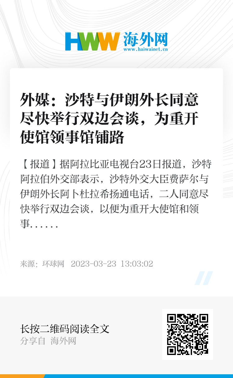 3月10日,中国、沙特和伊朗在北京发表三方联合声明。在该声明中,三国宣布,沙特和伊朗达成一份协议,包括同意恢复双方外交关系,在至多两个月内重开双方使馆和代表机构,安排互派大使,并探讨加强双边关系。中共中央政治局委员、中央外办主任王毅10日在主持沙特和伊朗北京对话闭幕式后表示,这是对话的胜利、和平的胜利,为当前动荡不安的世界提供了重大利好消息,传递了明确信号。