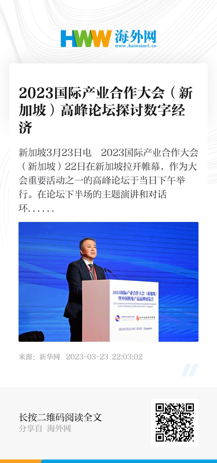 新华网新加坡3月23日电 2023国际产业合作大会(新加坡)22日在新加坡拉开帷幕,作为大会重要活动之一的高峰论坛于当日下午举行。在论坛下半场的主题演讲和对话环节,与会嘉宾围绕“数字经济”主题进行深入交流。