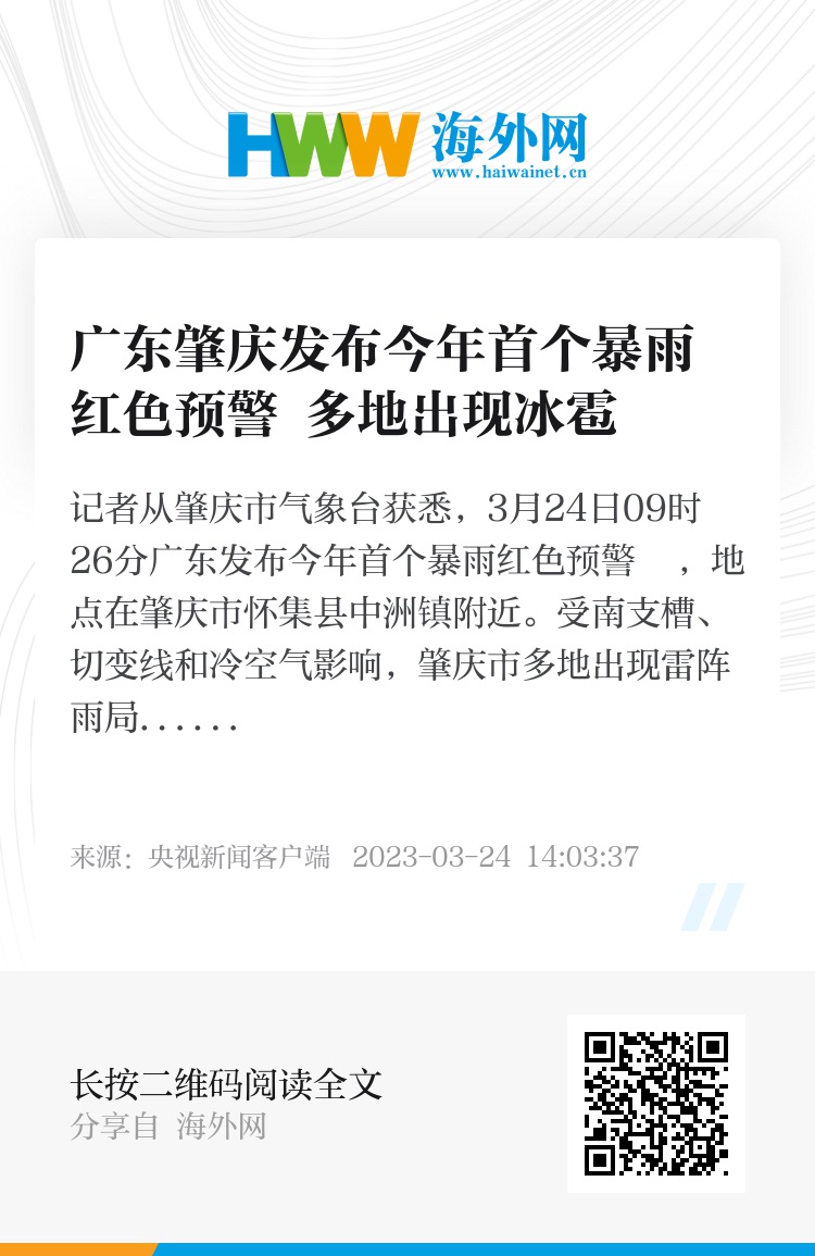 记者从肇庆市气象台获悉,3月24日09时26分广东发布今年首个暴雨红色预警 ,地点在肇庆市怀集县中洲镇附近。受南支槽、切变线和冷空气影响,肇庆市多地出现雷阵雨局部大雨和冰雹等强对流天气,怀集县洽水镇大洞田村出现最大雨量33.5毫米,德庆县悦城镇、广宁县县城、广宁县木格镇、怀集县诗洞镇出现今年首场冰雹。据预计,3月23日夜间至25日,肇庆市各地将有大雨局部暴雨,并伴有大幅降温和强对流天气。