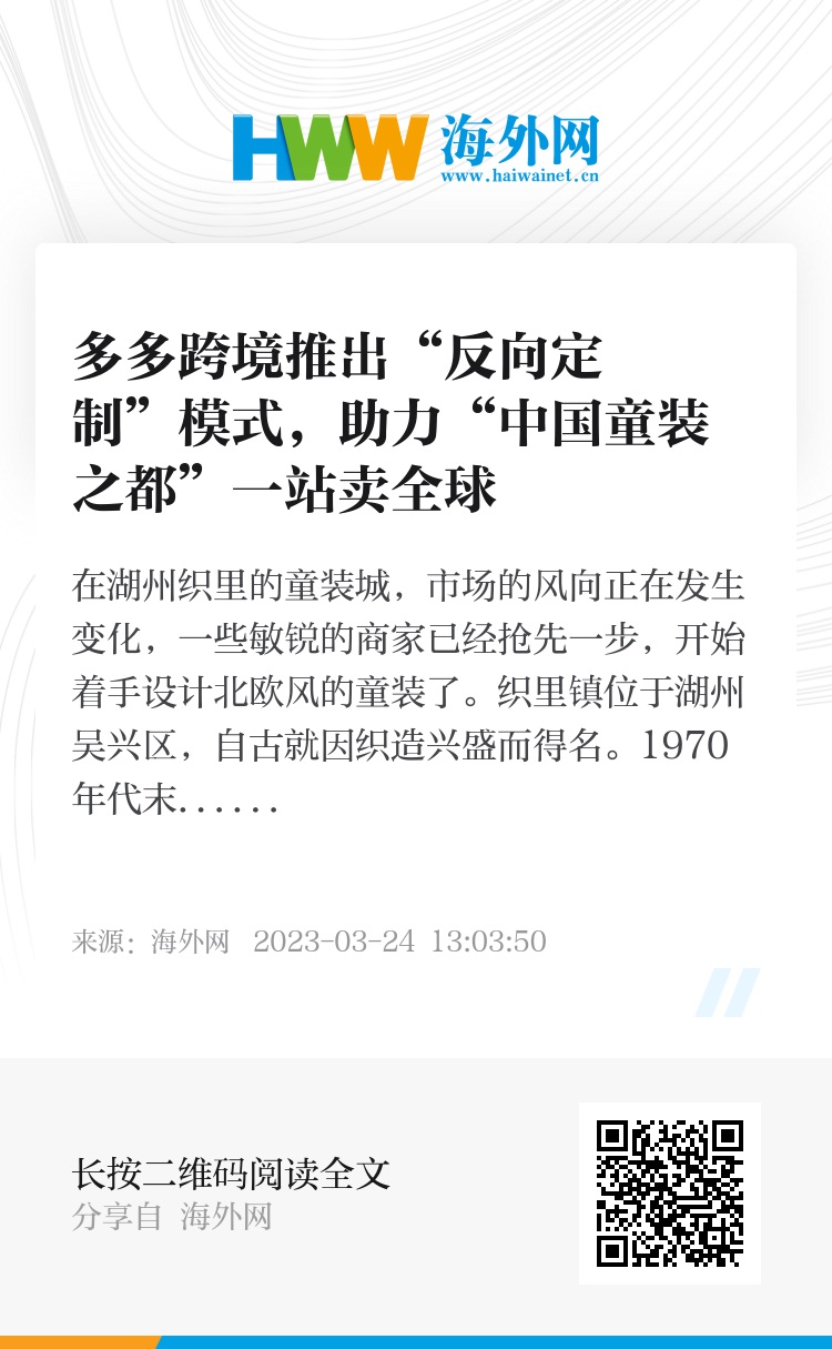 3月16日,拼多多旗下多多跨境电商业务童装类目的专项团队也来到织里,在湖州商务局的指导下,与当地童装办、电商协会、跨境电商服务平台象屿集团以及50余家童装企业,深入探讨了童装出海的一体化方案,并推动多家童装企业上行多多跨境平台,也开启了织里童装“一站卖全球”的新探索。