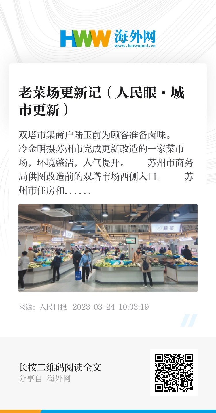 近年来,苏州市住房和城乡建设局还陆续出台《既有建筑改造施工图设计审查要点》《苏州市城市更新既有建筑消防设计技术指南(试行)》等文件。“把前期更新改造的相关做法形成标准、规范,为接下来全市菜市场的更新改造、城市更新行动提供依据和借鉴。”王晓东说。