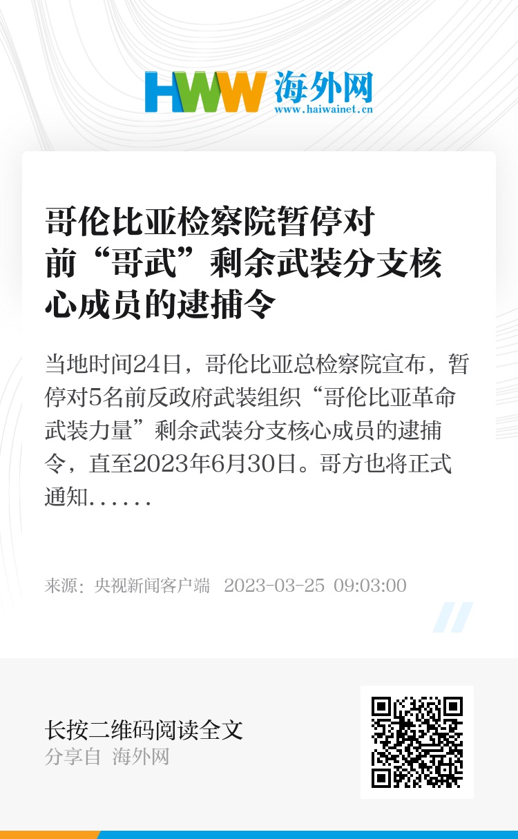 当地时间24日,哥伦比亚总检察院宣布,暂停对5名前反政府武装组织“哥伦比亚革命武装力量”剩余武装分支核心成员的逮捕令,直至2023年6月30日。哥方也将正式通知国际刑警组织中止对上述人员的通缉。