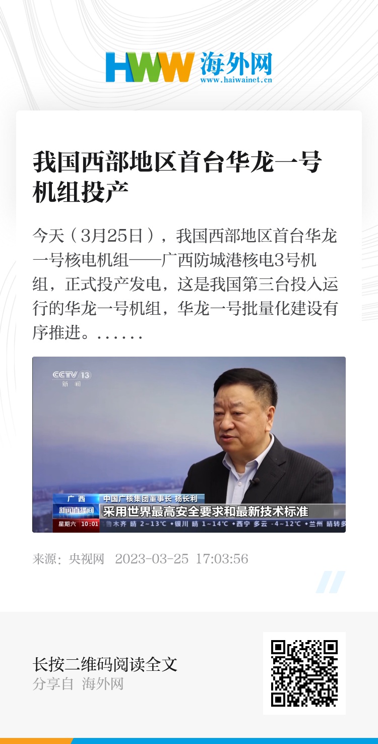 今天(3月25日),我国西部地区首台华龙一号核电机组——广西防城港核电3号机组,正式投产发电,这是我国第三台投入运行的华龙一号机组,华龙一号批量化建设有序推进。