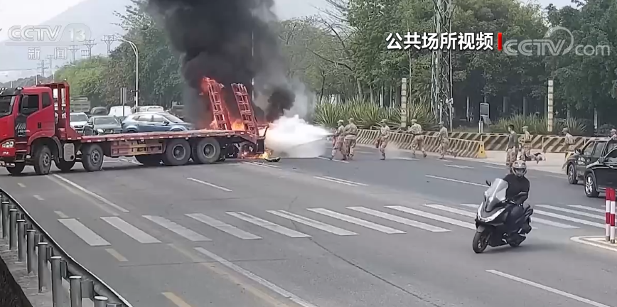 在福建省厦门市集美区灌口大道,一辆半挂牵引车正在掉头,一辆黑色小轿车来不及刹车,直接导致两车相撞。事故发生后,黑色小轿车开始燃起明火。正在附近训练的官兵们,发现事故后第一时间向上级报告,与此同时,应急分队立即携带灭火器、医疗救护器材赶往事故现场,展开救援。