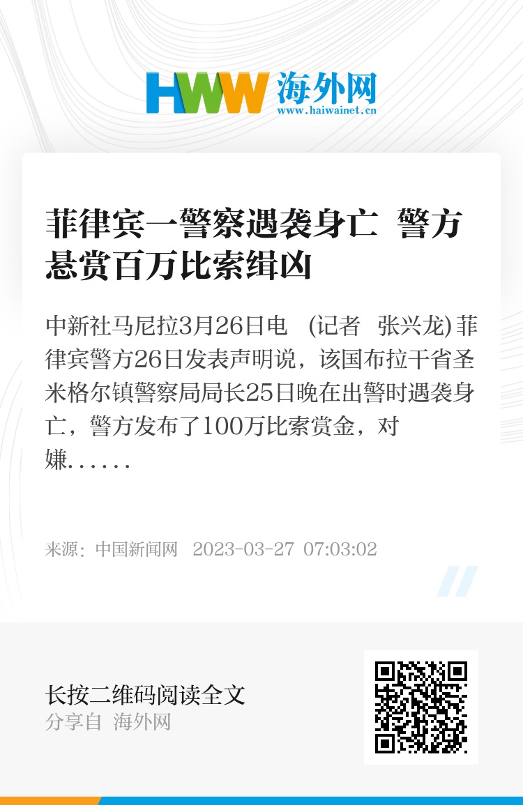 中新社马尼拉3月26日电 (记者 张兴龙)菲律宾警方26日发表声明说,该国布拉干省圣米格尔镇警察局局长25日晚在出警时遇袭身亡,警方发布了100万比索赏金,对嫌疑人进行悬赏通缉。