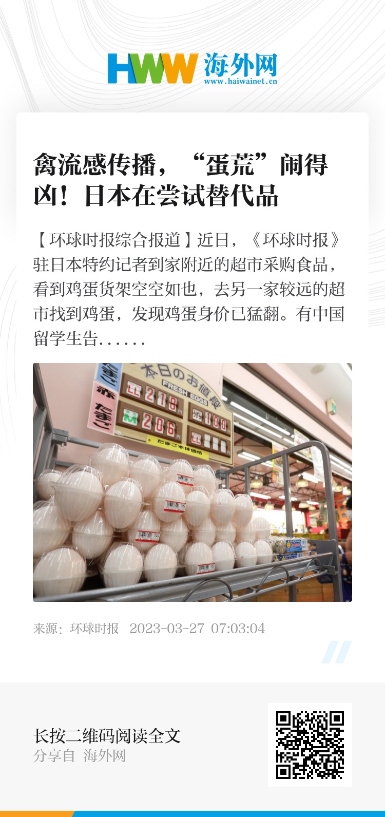 据日本《朝日新闻》3月26日报道,由于禽流感传播,日本国内的鸡蛋供应不足问题正在加剧。据日本农林水产省统计,自2022年10月底以来,在26个道县中,确认感染禽流感的养鸡场共有81家。目前约有1645万只鸡被消杀,创下历史最高纪录。其中共有1528万只是下蛋鸡,导致日本全国的下蛋鸡数量减少约10%。《朝日新闻》称,通常而言出现禽流感的养鸡场要想完全恢复生产需3-7个月时间。尽管部分养鸡场已开始引入新鸡,但日本农林水产大臣野村哲郎表示,“大约需要半年时间才能完全恢复鸡蛋供应。”此外,其他国家鲜少生产生食蛋,导致日本“蛋荒”难以靠进口解决。