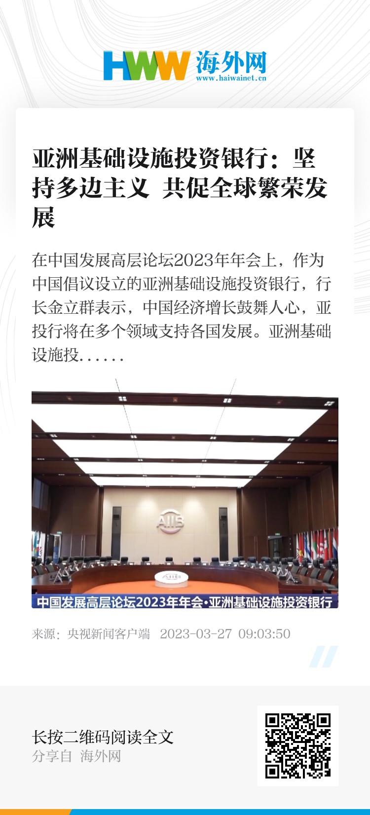 在中国发展高层论坛2023年年会上,作为中国倡议设立的亚洲基础设施投资银行,行长金立群表示,中国经济增长鼓舞人心,亚投行将在多个领域支持各国发展。