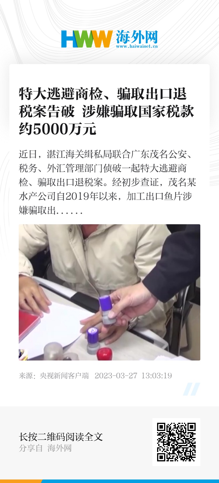 近日,湛江海关缉私局联合广东茂名公安、税务、外汇管理部门侦破一起特大逃避商检、骗取出口退税案。经初步查证,茂名某水产公司自2019年以来,加工出口鱼片涉嫌骗取出口退税货值约6.9亿元,骗取国家税款约5000万元。同时,涉嫌逃避商检货物价值约3000万元。