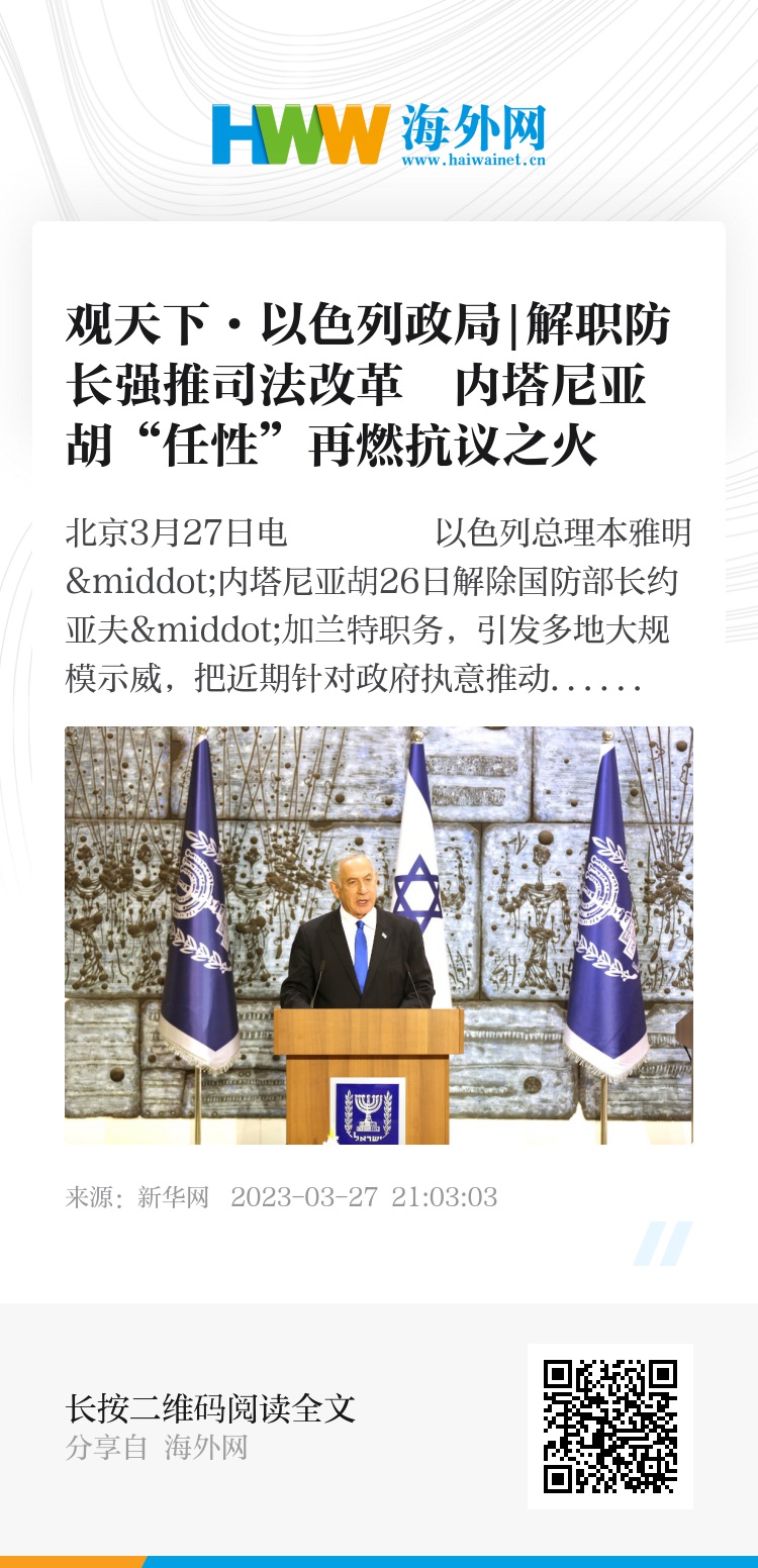 以色列总理府26日突然宣布解除加兰特防长职务,既未说明原委也未指明继任者。内塔尼亚胡随后在社交媒体推特说,必须抵制阻碍司法改革的力量。