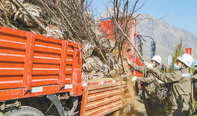 今年3月,石嘴山市参加春季义务植树的单位员工在搬运树苗。