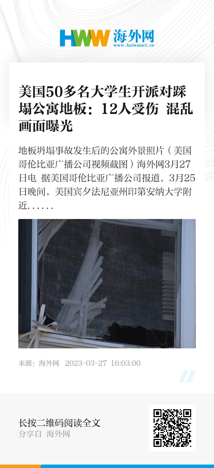 海外网3月27日电 据美国哥伦比亚广播公司报道,3月25日晚间,美国宾夕法尼亚州印第安纳大学附近,一所学生公寓的地板突然坍塌,导致12名学生受伤。