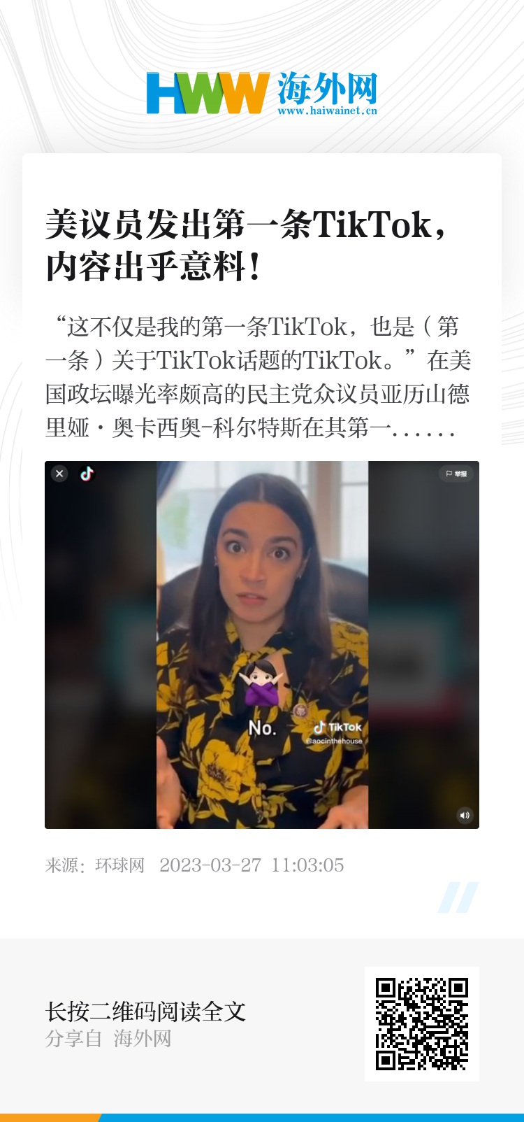 奥卡西奥-科尔特斯在视频中说,“我认为TikTok应该被封禁吗?不。”她接着谈到美国政府试图封禁TikTok的原因。“他们说,由于这种惊人的数据收集量,我们应该禁止这款应用程序。然而,这并没有真正解决问题的核心,”《国会山报》称,这名坦率的美国会议员表示,美国大型社交媒体公司是被允许收集这些数据的,因为没有相应的法规约束。“事实上,美国是全球仅有的几个没有重要的数据或隐私保护法律的发达国家之一...... 所以对我来说,目前的解决方案不是封禁单个公司,而是切实保护美国人免受这种惊人的数据收集(的伤害)。”“通常,当美国提出一项非常重大的举措,(且该举措)涉及国家安全这一重大风险时,首先要做的事情之一就是国会会收到一份秘密简报 ,”说到这里,她表示到目前为止并没有发生这一幕。她还在视频上配了一张卡塔尔半岛电视台今年1月的一篇报道截图,文章标题为“一美国州要求提供封禁TikTok的证据,但美国联邦调查局什么也没有提供”。“所以,我们为什么要针对如此重大的问题直接提出禁令呢?我就是觉得不太对。”奥卡西奥-科尔特斯说道。