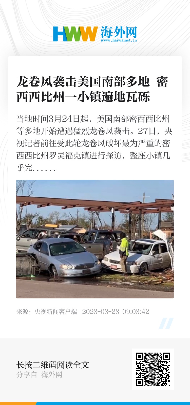 当地时间3月24日起,美国南部密西西比州等多地开始遭遇猛烈龙卷风袭击。27日,央视记者前往受此轮龙卷风破坏最为严重的密西西比州罗灵福克镇进行探访,整座小镇几乎完全被摧毁。