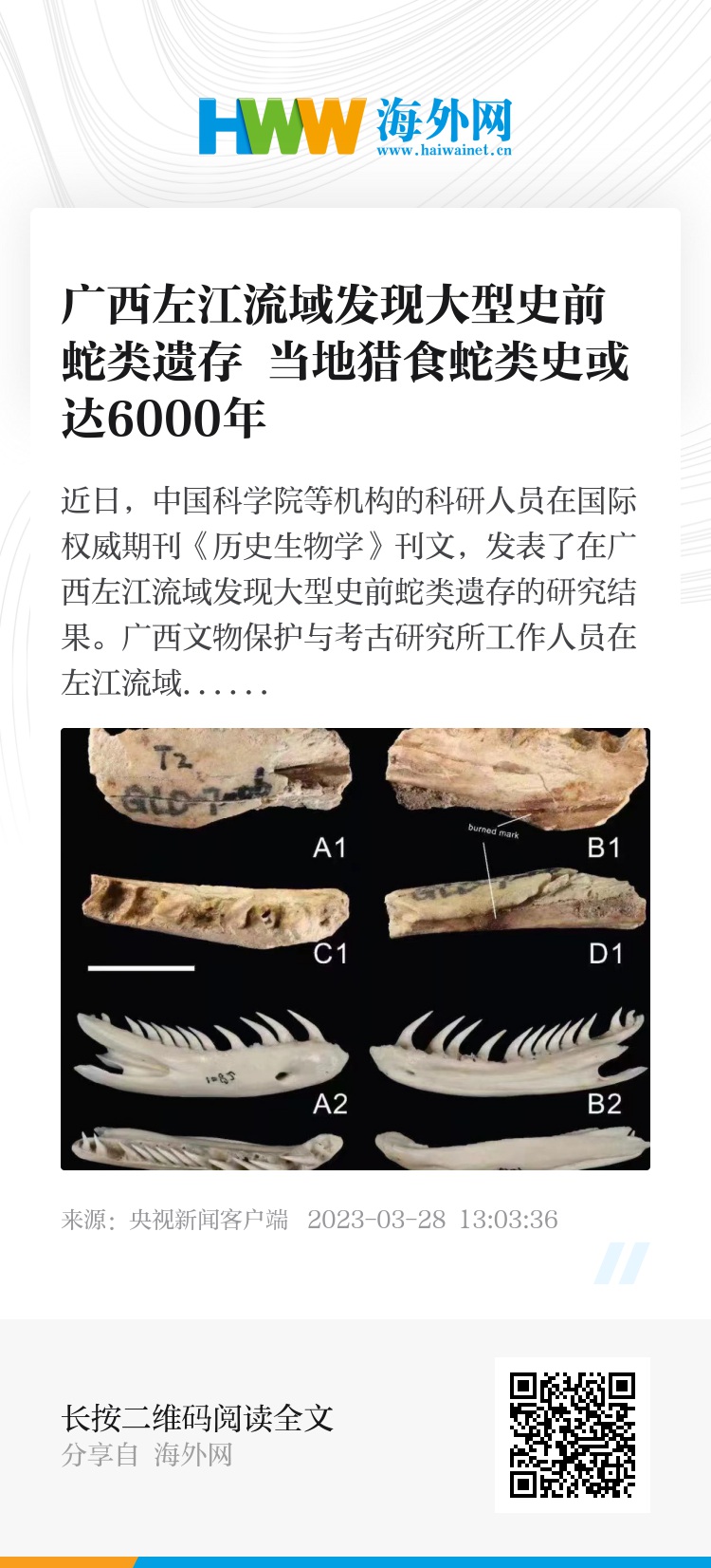 广西文物保护与考古研究所工作人员在左江流域经过近3年的发掘研究,发现多处新石器时代贝丘遗址。研究人员对左江流域距今约6000年的宝剑山遗址和大湾遗址中发现的蛇骨进行形态学研究,确定了现存的缅甸蟒、眼镜王蛇和百花锦蛇三种蛇。