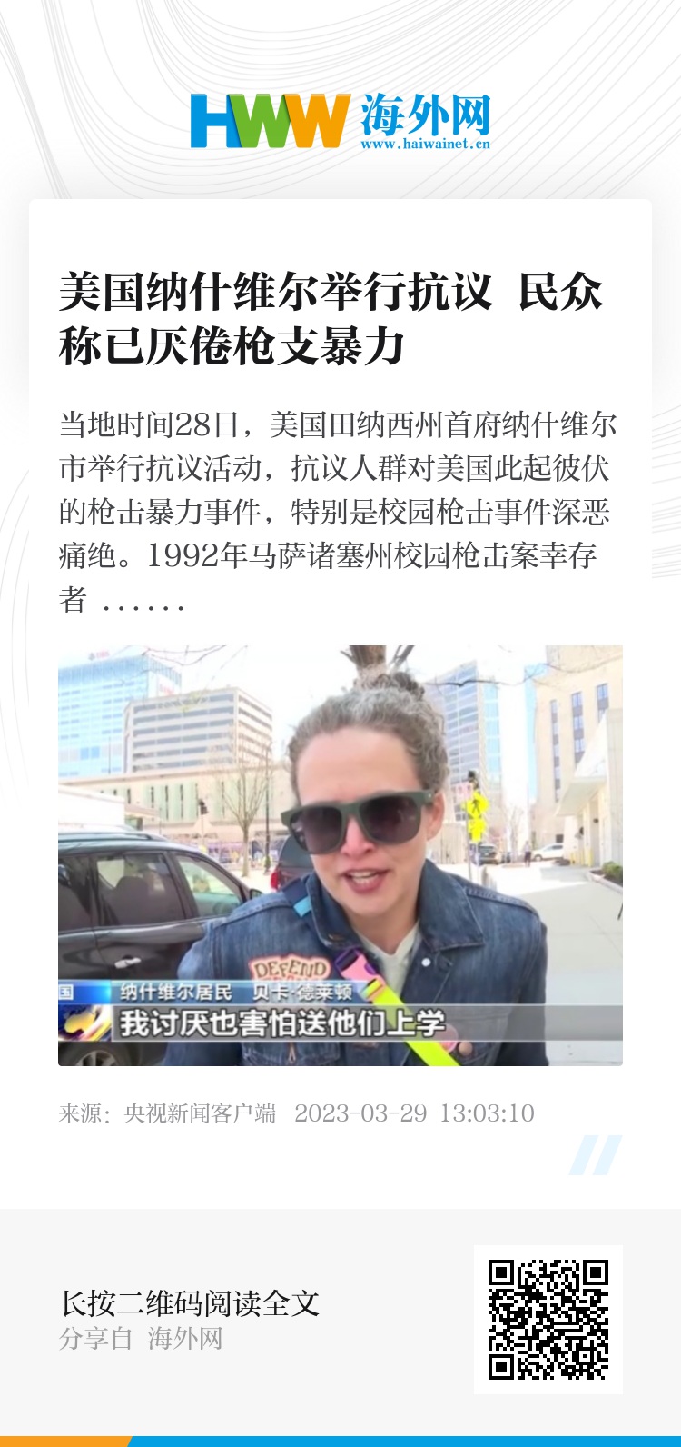 纳什维尔居民 贝卡·德莱顿:我家有上小学的孩子,我讨厌也害怕送他们上学,我厌倦了听到同龄的孩子去上学却不能回家的消息。作为一名家长,这种痛苦甚至超出了我的想象,所以我希望我们的立法者必须回应我们的诉求。