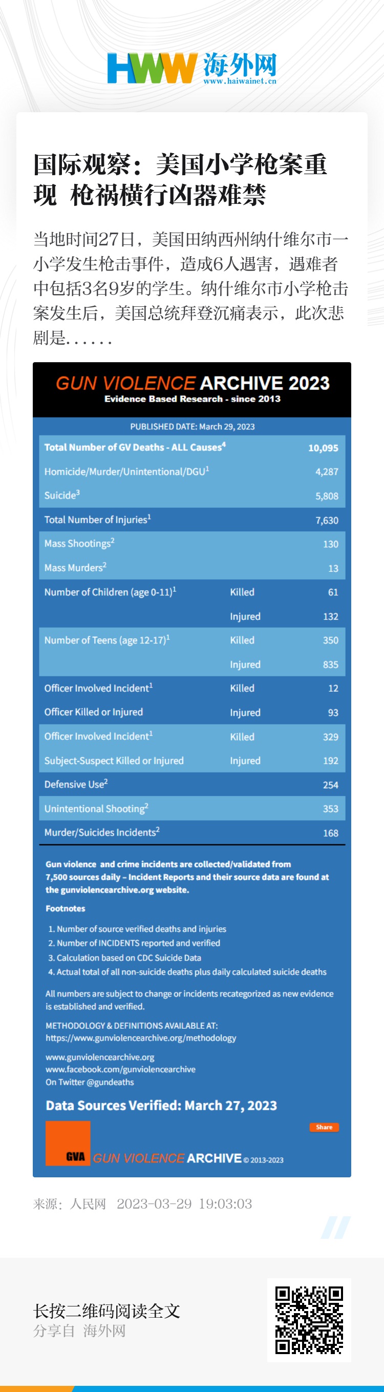 美国“枪支暴力档案”网站数据显示,截至3月27日,2023年美国已发生130起大规模枪击事件。图片来源:美国“枪支暴力档案”网站官网截图