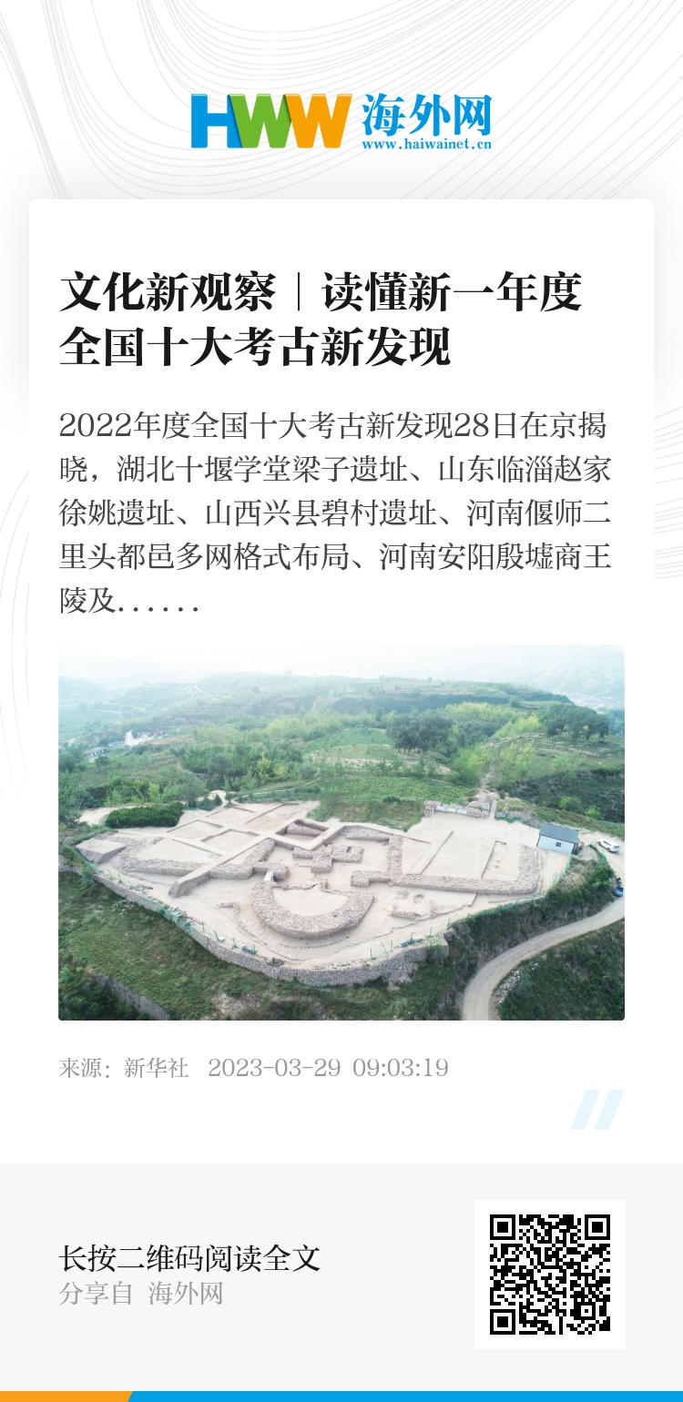 2022年度全国十大考古新发现28日在京揭晓,湖北十堰学堂梁子遗址、山东临淄赵家徐姚遗址、山西兴县碧村遗址、河南偃师二里头都邑多网格式布局、河南安阳殷墟商王陵及周边遗存、陕西旬邑西头遗址、贵州贵安新区大松山墓群、吉林珲春古城村寺庙址、河南开封州桥及附近汴河遗址、浙江温州朔门古港遗址入选。