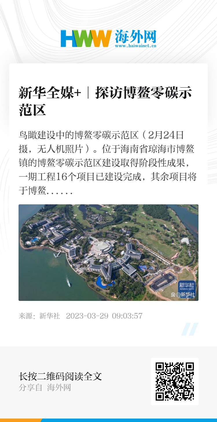 位于海南省琼海市博鳌镇的博鳌零碳示范区建设取得阶段性成果,一期工程16个项目已建设完成,其余项目将于博鳌亚洲论坛2024年年会前完成,并全面实现零碳运行。据了解,零碳示范区是在一定区域内通过集成应用能源、建筑、交通、废弃物处理等多领域深度减排技术,新建林业碳汇等高质量抵消措施,实现碳排放总量持续降低并逐步趋于零的示范区。