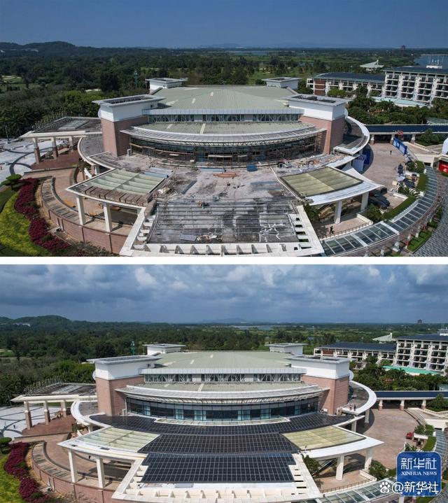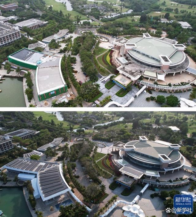 这是一张拼版照片:上图为博鳌零碳示范区内改造前的博鳌亚洲论坛国际会议中心(2月24日摄,无人机照片);下图为改造后的博鳌亚洲论坛国际会议中心(3月15日摄,无人机照片)。