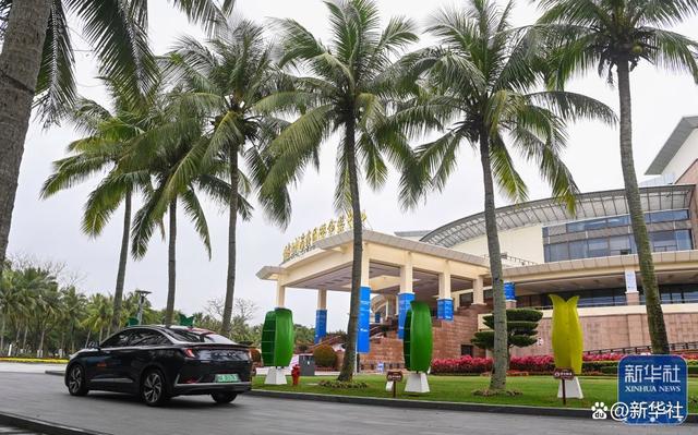 3月28日,一辆新能源车从博鳌零碳示范区内的花朵风机前驶过。
