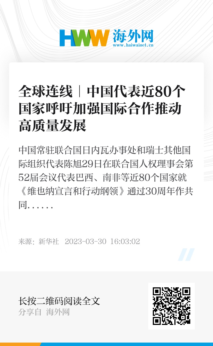 中国常驻联合国日内瓦办事处和瑞士其他国际组织代表陈旭29日在联合国人权理事会第52届会议代表巴西、南非等近80个国家就《维也纳宣言和行动纲领》通过30周年作共同发言,呼吁加强国际合作,重振《宣言》精神,推动实现高质量发展。