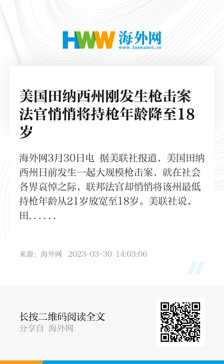海外网3月30日电 据美联社报道,美国田纳西州日前发生一起大规模枪击案,就在社会各界哀悼之际,联邦法官却悄悄将该州最低持枪年龄从21岁放宽至18岁。