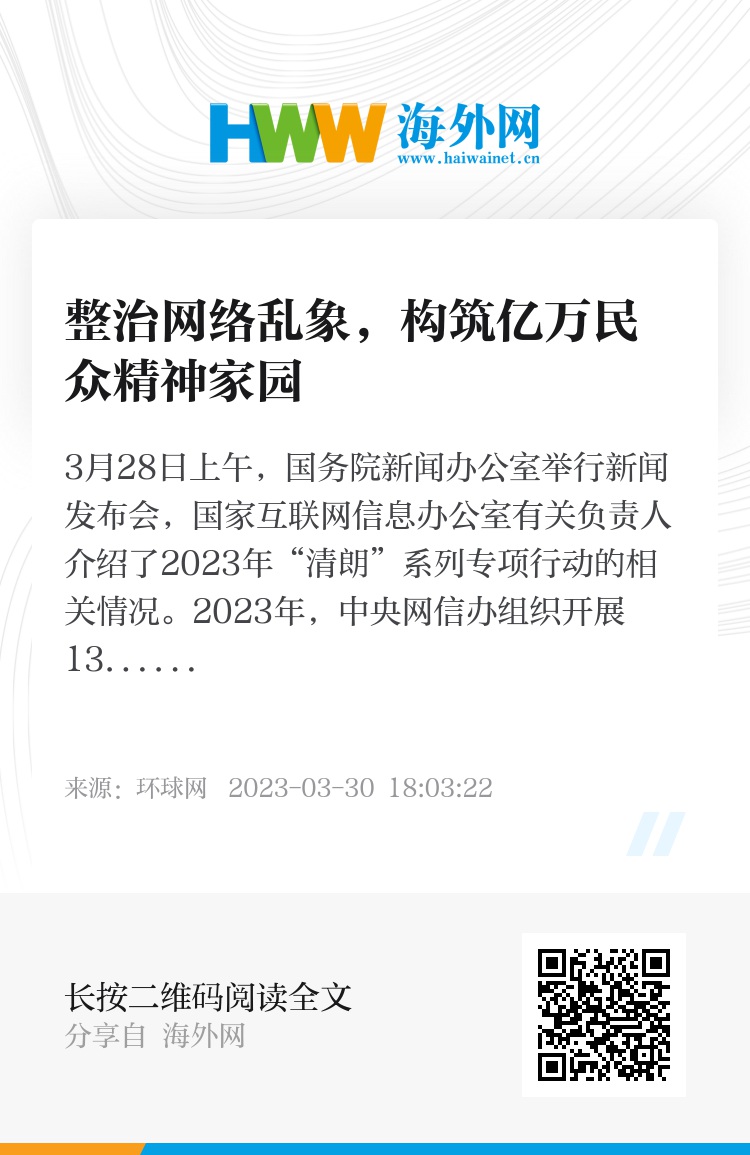3月28日上午,国务院新闻办公室举行新闻发布会,国家互联网信息办公室有关负责人介绍了2023年“清朗”系列专项行动的相关情况。2023年,中央网信办组织开展13项“清朗”专项行动,累计清理违法和不良信息5430余万条,处置账号680余万个,下架APP、小程序2890余款,解散关闭群组、贴吧等26万个,关闭网站超过7300家,有力维护网民合法权益。