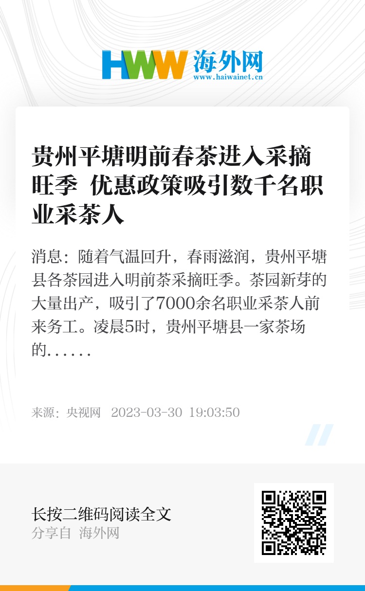 央视网消息:随着气温回升,春雨滋润,贵州平塘县各茶园进入明前茶采摘旺季。茶园新芽的大量出产,吸引了7000余名职业采茶人前来务工。