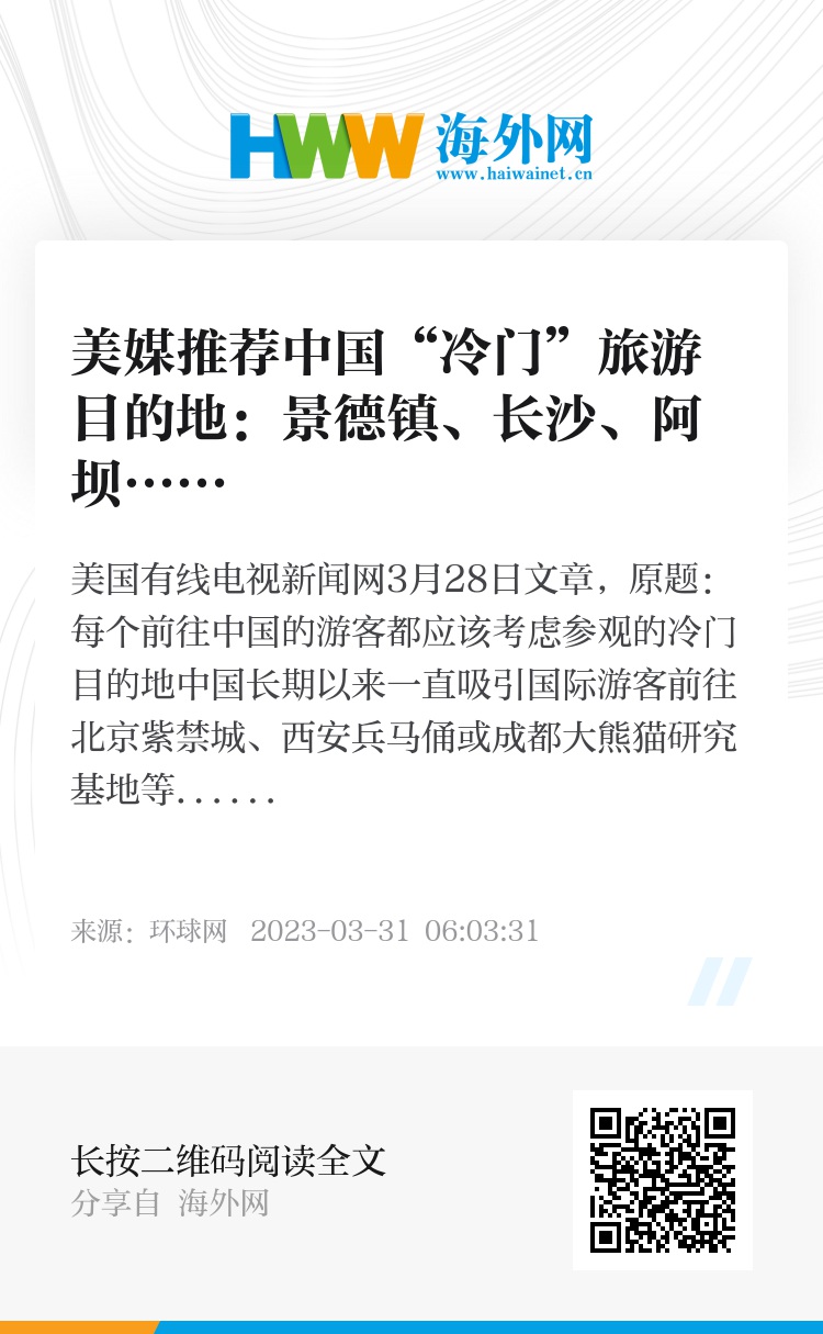 美国有线电视新闻网3月28日文章,原题:每个前往中国的游客都应该考虑参观的冷门目的地中国长期以来一直吸引国际游客前往北京紫禁城、西安兵马俑或成都大熊猫研究基地等热门景点。但对想体验这个国家游客相对较少的地方的人来说,我们整理出一份拥有丰富文化和美丽风景的旅游目的地清单,供您计划下一次中国之行时考虑。