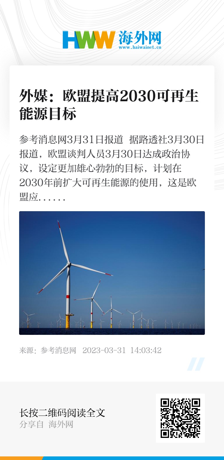 参考消息网3月31日报道 据路透社3月30日报道,欧盟谈判人员3月30日达成政治协议,设定更加雄心勃勃的目标,计划在2030年前扩大可再生能源的使用,这是欧盟应对气候变化和结束使用俄罗斯化石燃料计划的一个重要支柱。