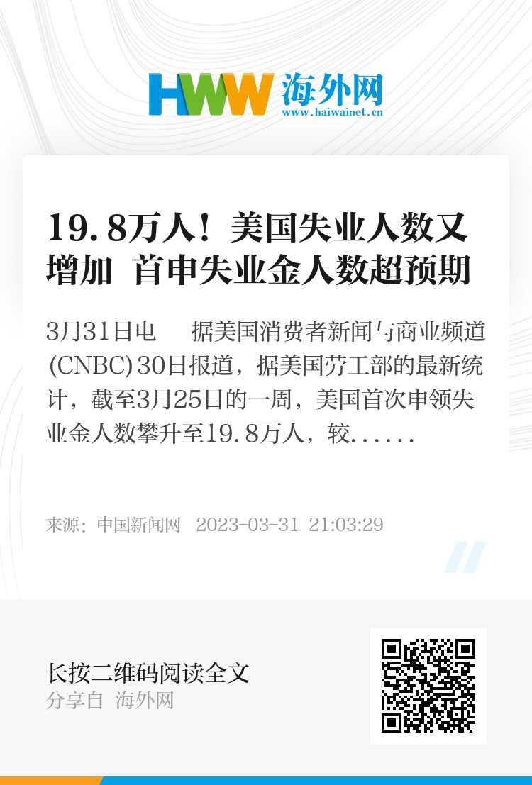 中新网3月31日电 据美国消费者新闻与商业频道(CNBC)30日报道,据美国劳工部的最新统计,截至3月25日的一周,美国首次申领失业金人数攀升至19.8万人,较上一周增加7000人,高于预期的19.5万人。