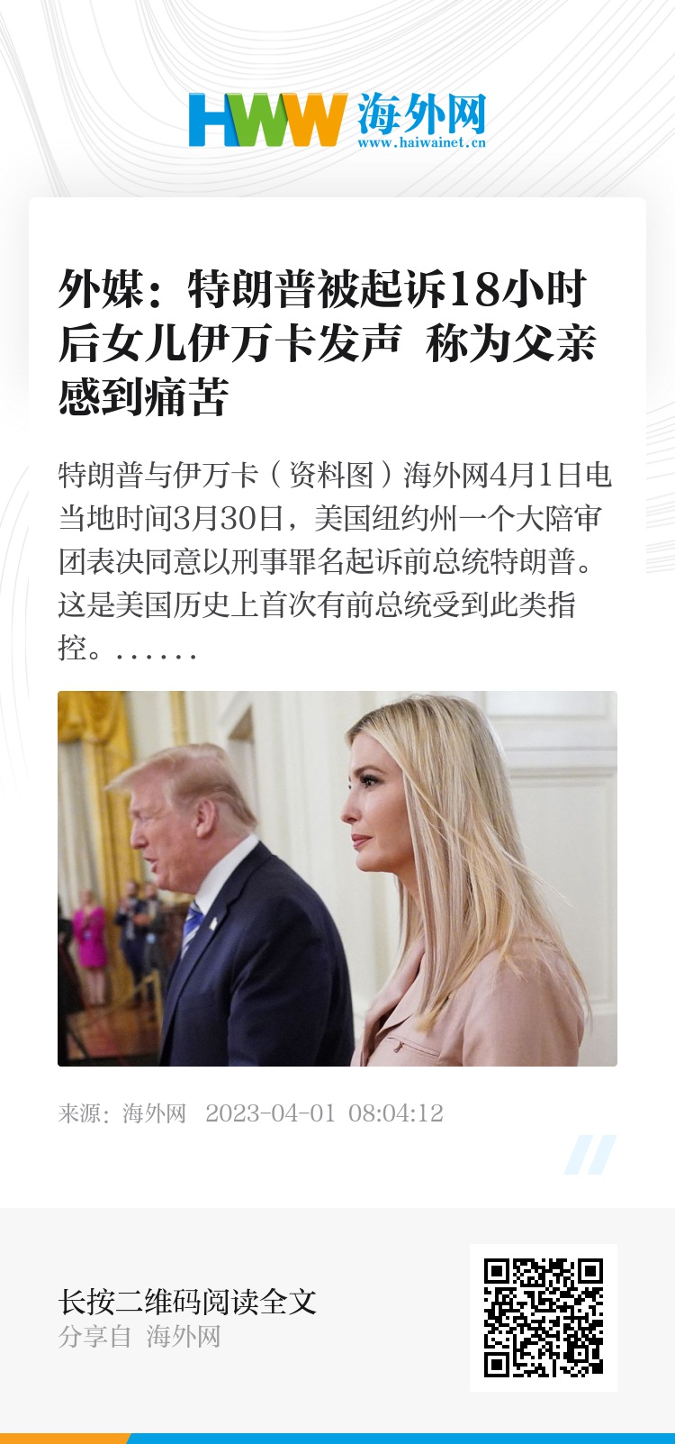 当地时间3月31日,伊万卡在她的社交媒体上表示:“我爱我的父亲和国家。今天,我为两者感到痛苦。我感谢各个政治派别表达支持和关切的声音。”英国《独立报》表示,特朗普的两个儿子小唐纳德·特朗普和埃里克·特朗普在新闻发布后立即发文指责检察机关“行为不当”,而伊万卡则是在约18个小时后才打破沉默,谈到父亲被刑事起诉一事。