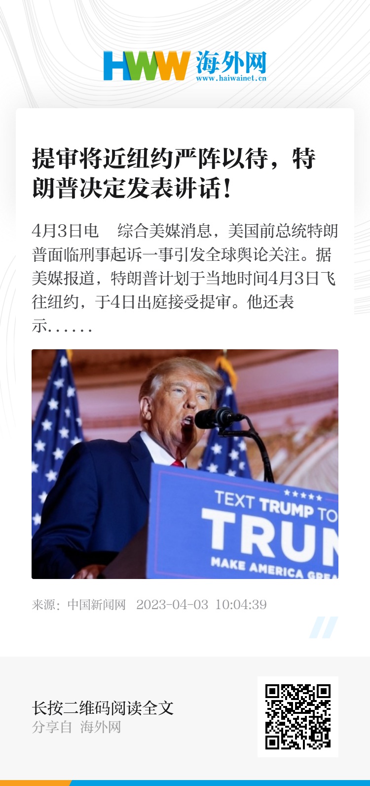 中新网4月3日电 综合美媒消息,美国前总统特朗普面临刑事起诉一事引发全球舆论关注。据美媒报道,特朗普计划于当地时间4月3日飞往纽约,于4日出庭接受提审。他还表示,自己随后将会发表讲话。与此同时,纽约政府也在为这一特别事件强化安保,并计划关闭城市的几条主要街道。