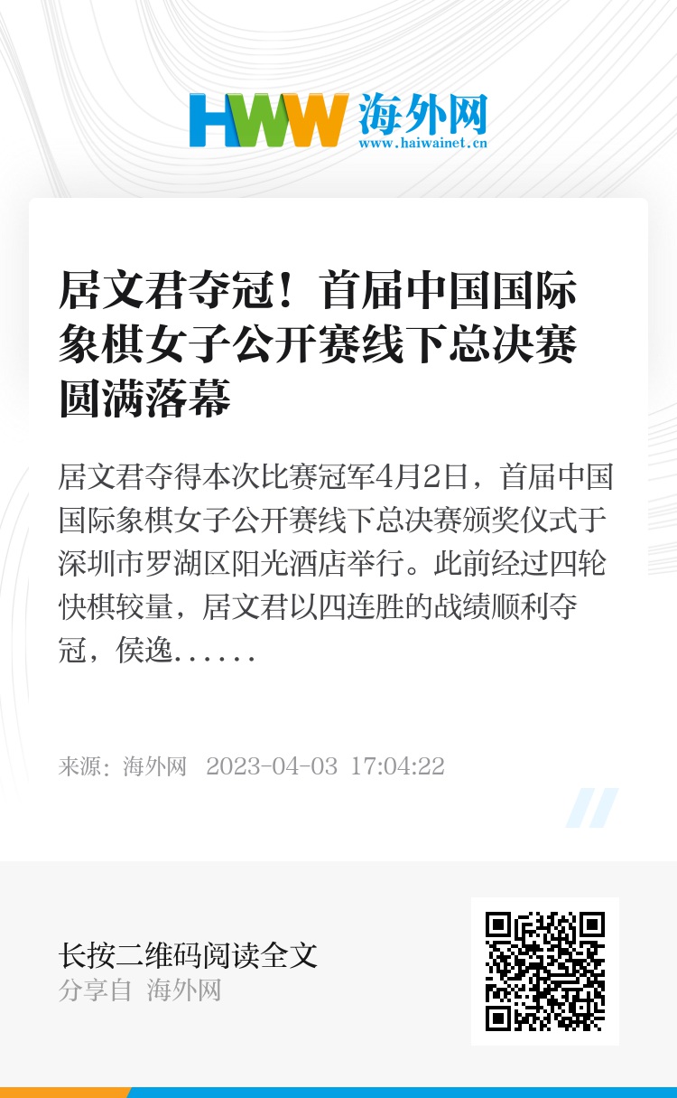 4月2日,首届中国国际象棋女子公开赛线下总决赛颁奖仪式于深圳市罗湖区阳光酒店举行。此前经过四轮快棋较量,居文君以四连胜的战绩顺利夺冠,侯逸凡紧随其后收获亚军,郭琦、赵盛鑫分获季军、殿军。
