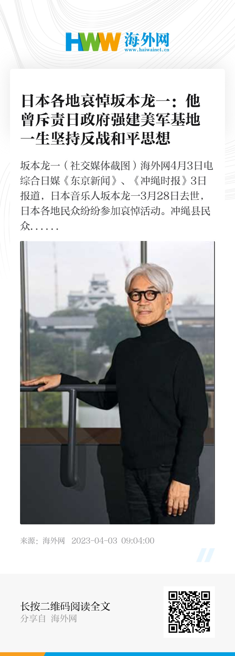 海外网4月3日电 综合日媒《东京新闻》、《冲绳时报》3日报道,日本音乐人坂本龙一3月28日去世,日本各地民众纷纷参加哀悼活动。
