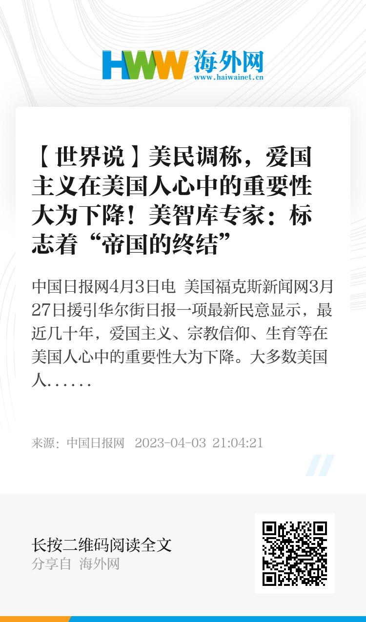 中国日报网4月3日电 美国福克斯新闻网3月27日援引华尔街日报一项最新民意显示,最近几十年,爱国主义、宗教信仰、生育等在美国人心中的重要性大为下降。