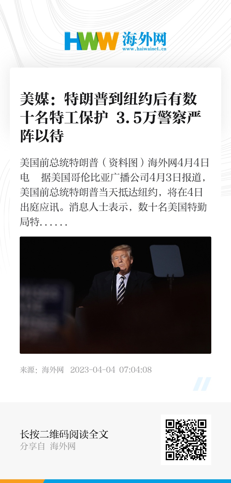 海外网4月4日电 据美国哥伦比亚广播公司4月3日报道,美国前总统特朗普当天抵达纽约,将在4日出庭应讯。消息人士表示,数十名美国特勤局特工被派往保护特朗普,3.5万名警察也已严阵以待。