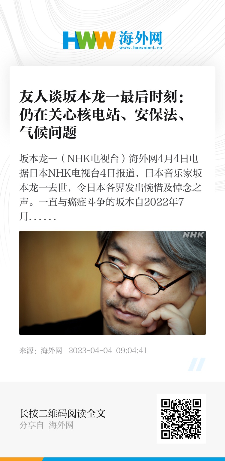 海外网4月4日电 据日本NHK电视台4日报道,日本音乐家坂本龙一去世,令日本各界发出惋惜及悼念之声。一直与癌症斗争的坂本自2022年7月起至其去世前一个月,在日本月刊杂志刊发自传,负责编辑称坂本直到最后一刻,也在关心影响民众生活的大事。