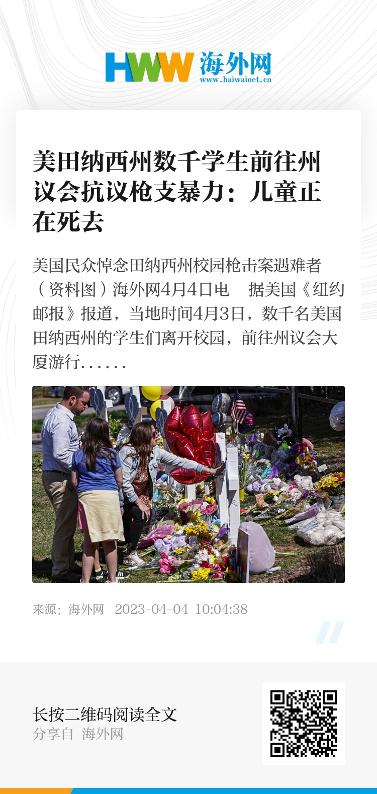 海外网4月4日电 据美国《纽约邮报》报道,当地时间4月3日,数千名美国田纳西州的学生们离开校园,前往州议会大厦游行抗议枪支暴力。